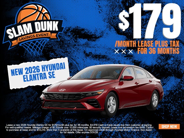 Lease a new 2026 Hyundai Elantra SE for $179/month plus tax for 36 months. $4,579 Cash or trade equity due from customer at signing. For well-qualified leases. Mileage charge of $0.20/mile over 10,000 miles/year. $0 security deposit. Lease end termination fee $400. Option to purchase at lease end for $13,210. More than 5 available at this lease. On approved credit through Hyundai Motor Finance. See dealer for full details. Offer expires 3/31/26.