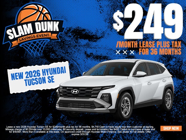 Lease a new 2026 Hyundai Tucson SE for $249/month plus tax for 36 months. $4,719 Cash or trade equity due from customer at signing. Mileage charge of $0.20/mile over 10,000 miles/year. $0 security deposit. Lease end termination fee $400. Option to purchase at lease end for $19,691. More than 5 available at this lease. On approved credit through Hyundai Motor Finance. See dealer for full details. Offer expires 3/31/26.