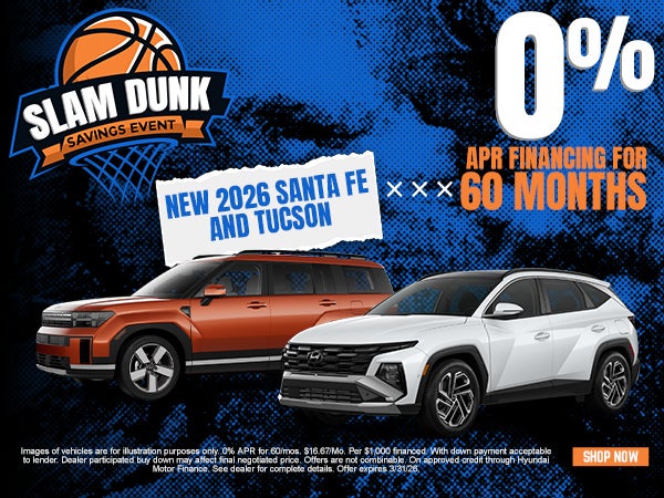 Images of vehicles are for illustration purposes only. 0% APR for 60/mos. $16.67/Mo. Per $1,000 financed. With down payment acceptable to lender. Dealer participated buy down may affect final negotiated price. Offers are not combinable. On approved credit through Hyundai Motor Finance. See dealer for complete details. Offer expires 3/31/26.