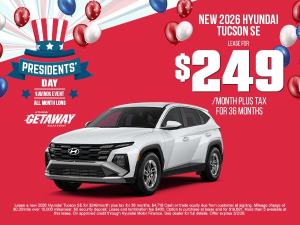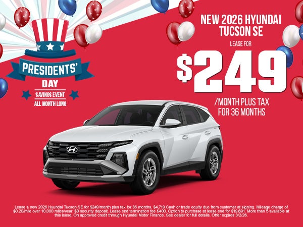 Lease a new 2026 Hyundai Tucson SE for $249/month plus tax for 36 months. $4,719 Cash or trade equity due from customer at signing. Mileage charge of $0.20/mile over 10,000 miles/year. $0 security deposit. Lease end termination fee $400. Option to purchase at lease end for $19,691. More than 5 available at this lease. On approved credit through Hyundai Motor Finance. See dealer for full details. Offer expires 3/2/26.